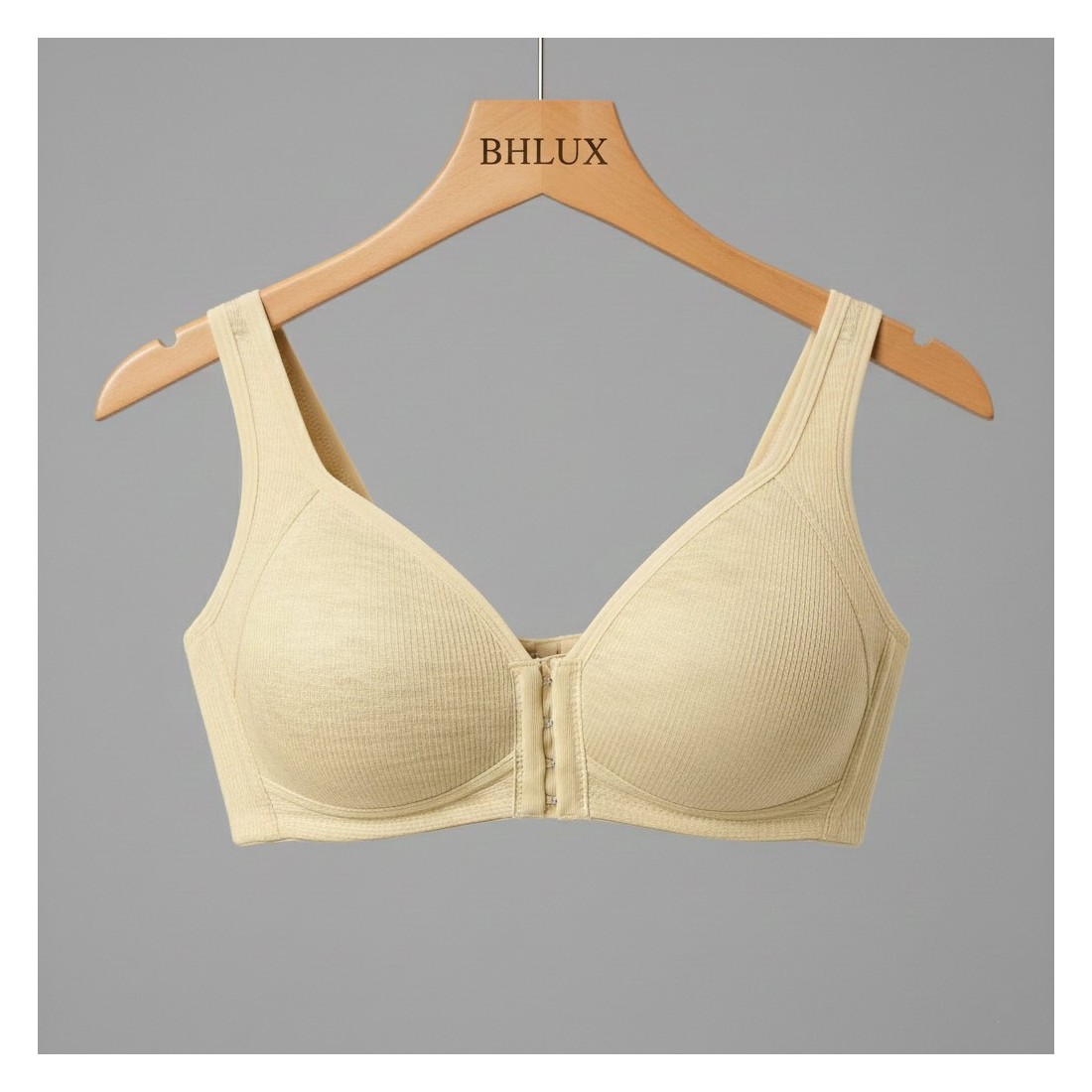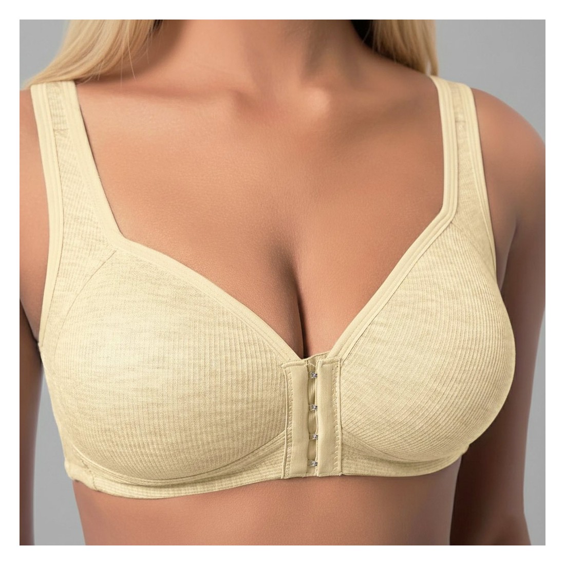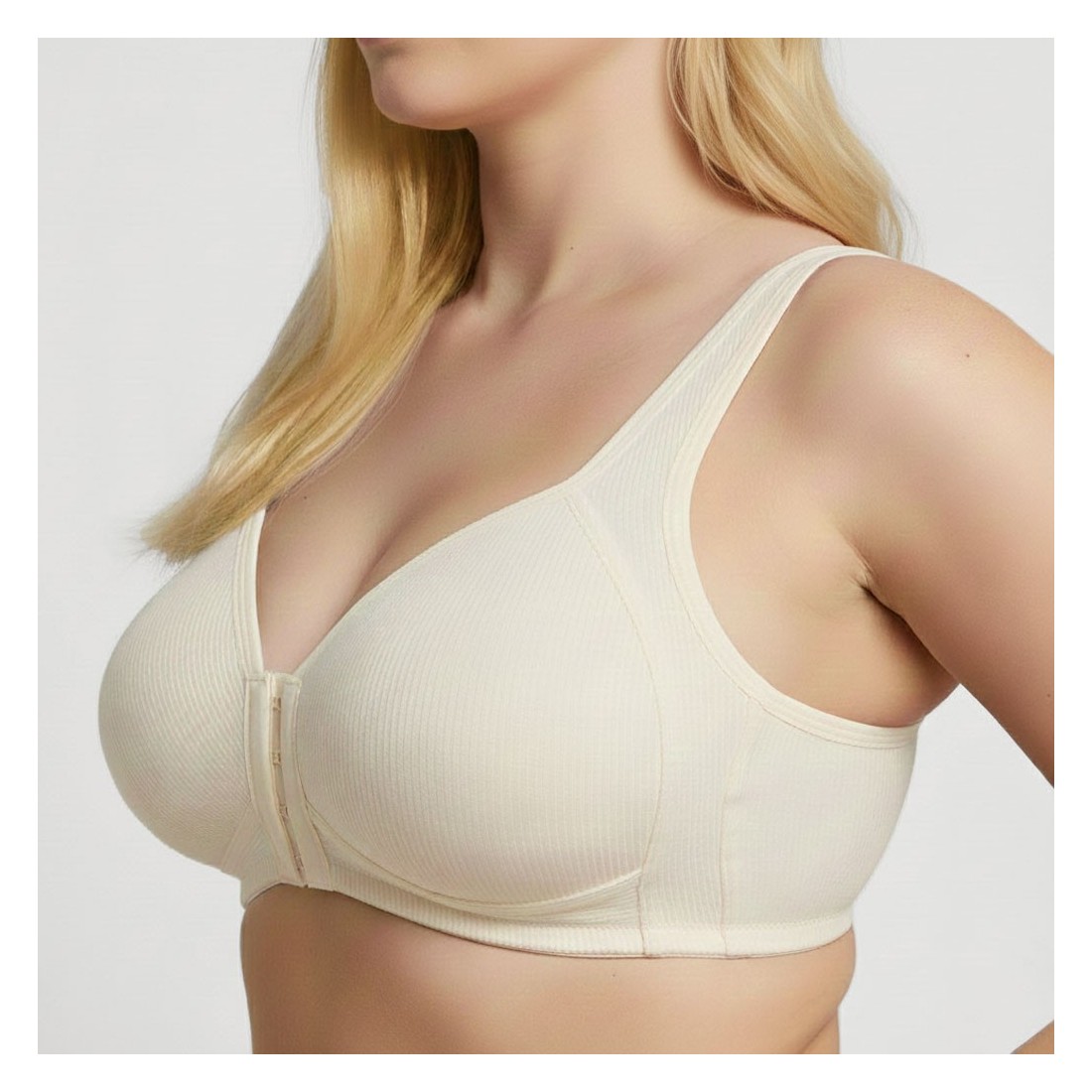 The Aria ComfortFit® Front Fastening Wireless Bra in Ivory offers gentle, wire-free support with the convenience of a secure front closure.